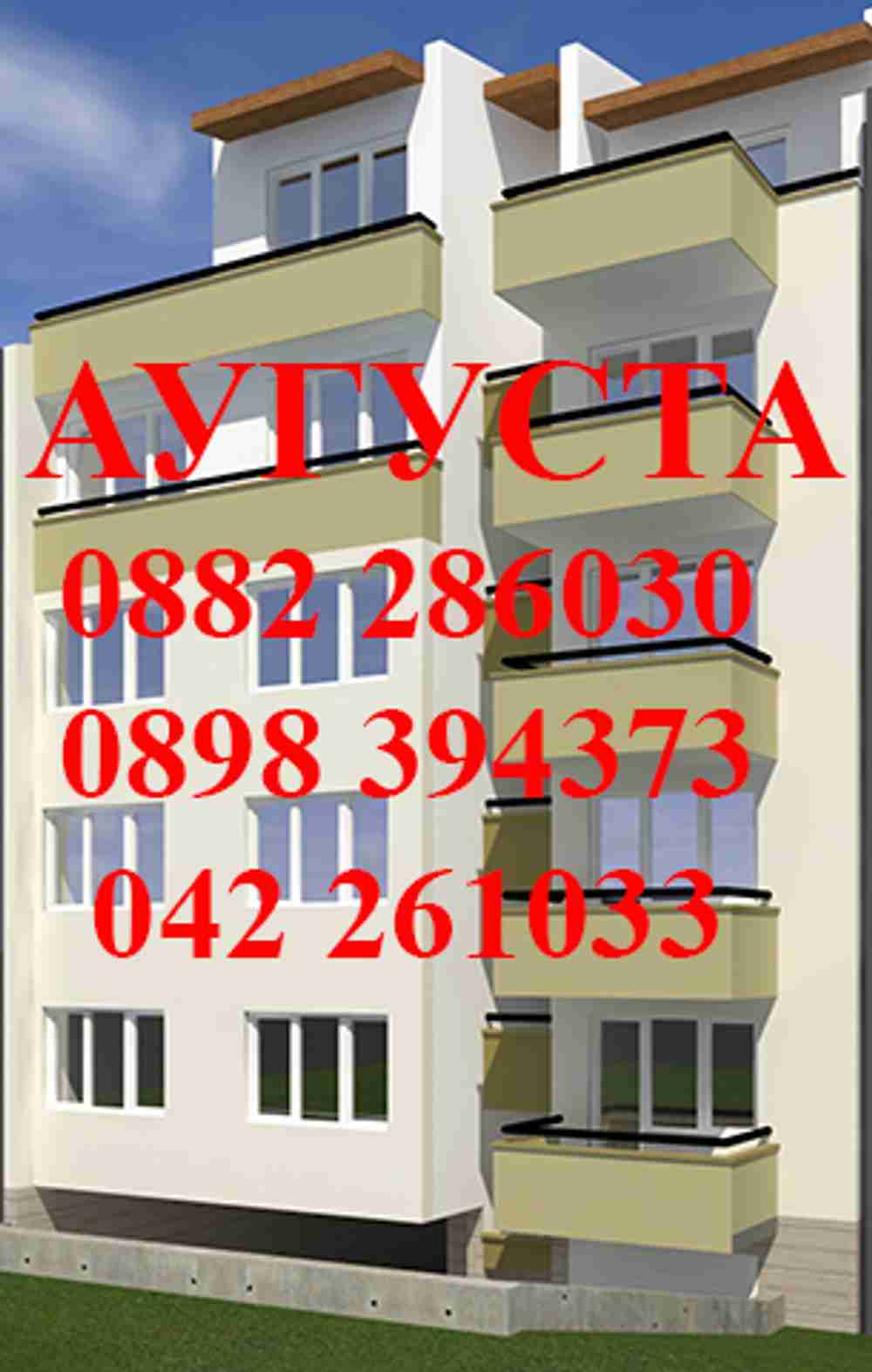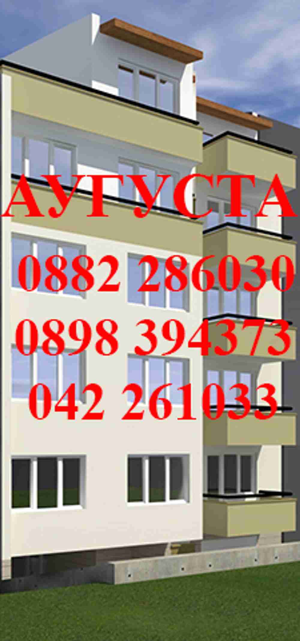 Описание: РЕФЕРЕНТЕН НОМЕР: ПРОДАВА МНОГО ИЗГОДНО!!! БЕЗ КОМИСИОНА!!!ЦЕНА НА ИНВЕСТИТОРА!!! Апартамент от 3 стаи с бокс,БЕЗ ПРЕХОДИ,с 2 тераси,баня с тоалетна и килер/СКЛАД/,изложение север-юг.НОВО СТРОИТЕЛСТВО ОТ СТРОИТЕЛНА КОМПАНИЯ с традиции в изпълнението на качествено жилищно строителство.Бутикова жилищна сграда с 9 апартамента,ОСД и гаражи,лукс общи части,асансьор, отлична локация- в близост до парк Аязмото,Окръжна болница,БИЛЛА,училища,детски градини, медицински центрове, спирки на обществен транспорт,магазини и търговски комплекси.Възможност за надземни гаражи. ОТЛИЧНА ИНВЕСТИЦИЯ!!! Проекти,3D и подробна информация само в офиса на АУГУСТА ИМОТИ,0882286030,0898394373,0898529277. АУГУСТА ИМОТИ предлага БЕЗПЛАТНО 100% съдействие за кредити от банки!!!Услугата не е обвързана с покупка на недвижим имот!АУГУСТА ИМОТИ ПРОДАВА СПЕЦИАЛНО ИЗБРАНИ ЗА ВАС КАЧЕСТВЕНИ ИМОТИ НА СОБСТВЕНИЦИ В ГРАДА И РЕГИОНА И БЕЗ КОМИСИОНА ДИРЕКТНО ОТ СТРОИТЕЛНИТЕ КОМПАНИИ НАД 40 СГРАДИ НОВО СТРОИТЕЛСТВО НА ТЕРИТОРИЯТА НА ГРАД СТАРА ЗАГОРА!!! | |
